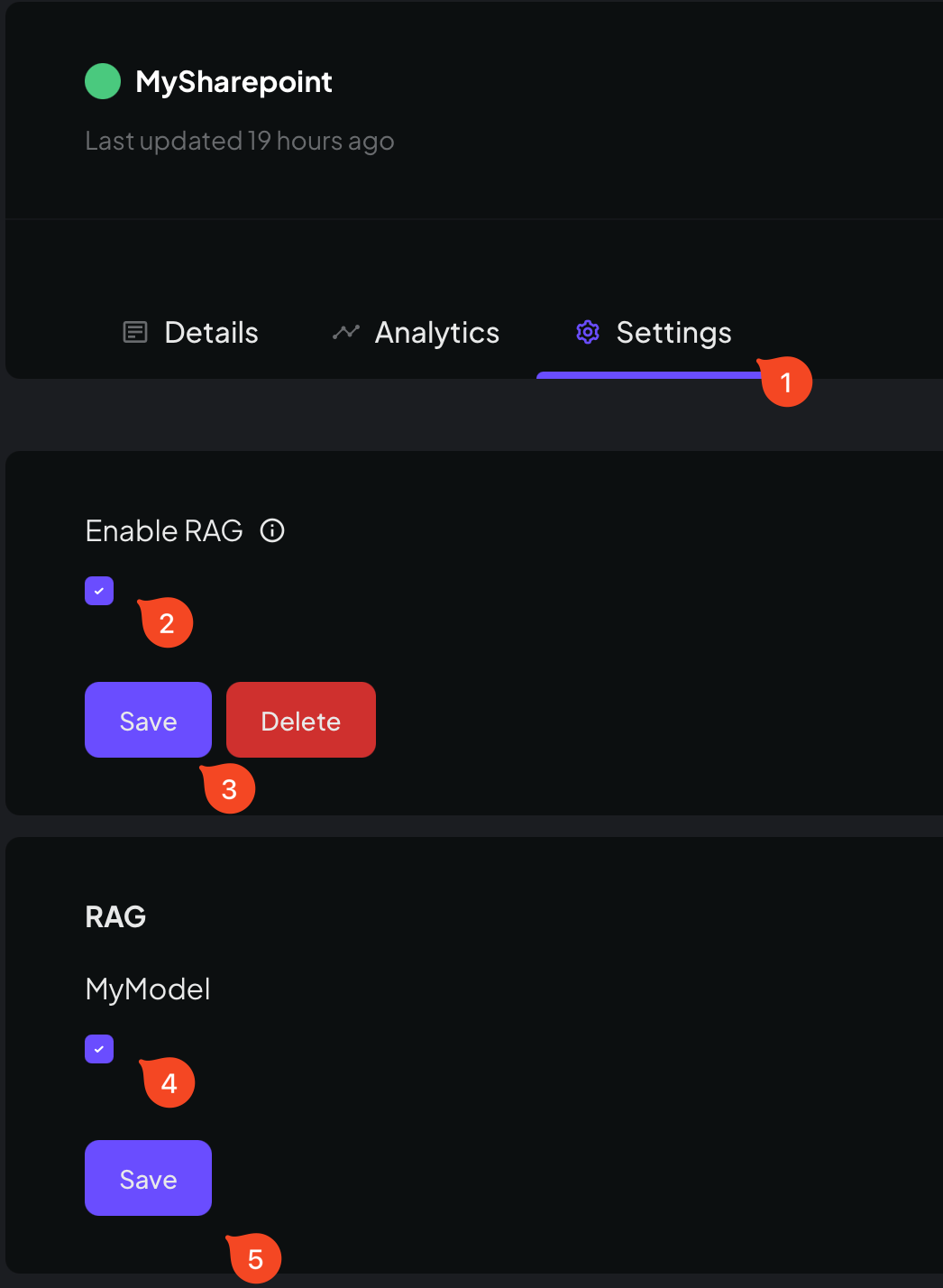 Click the source you've just created, go to settings. First enable RAG and press save. You'll see a new section called "RAG" pop up. Click the checkbox next to your model and then press save.