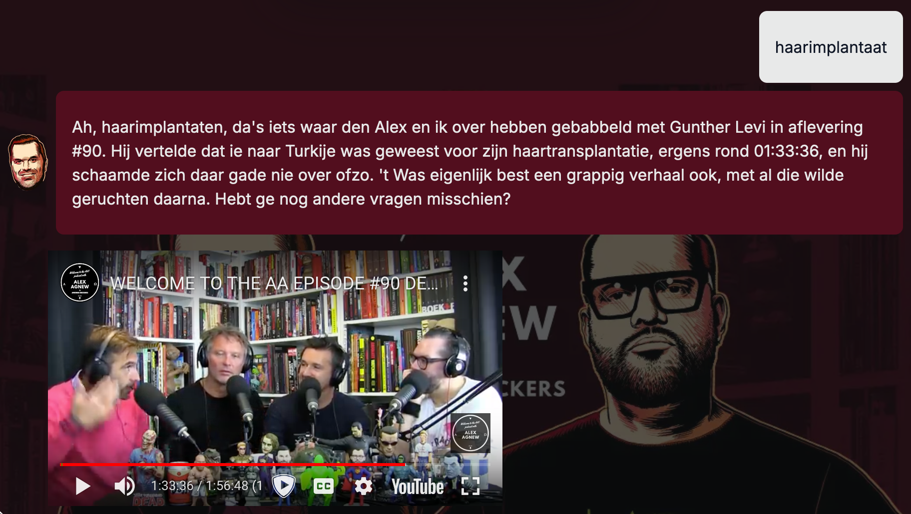 Our chatbot is powered by an automated pipeline that continuously scrapes the official "Welcome to the AA" YouTube channel for new episodes. Once an episode is detected, our custom-built Flemish transcription model—tailored specifically for this language—transforms the audio into accurate, searchable text. This specialized approach ensures that users can easily find the nuanced and region-specific references made throughout the show.